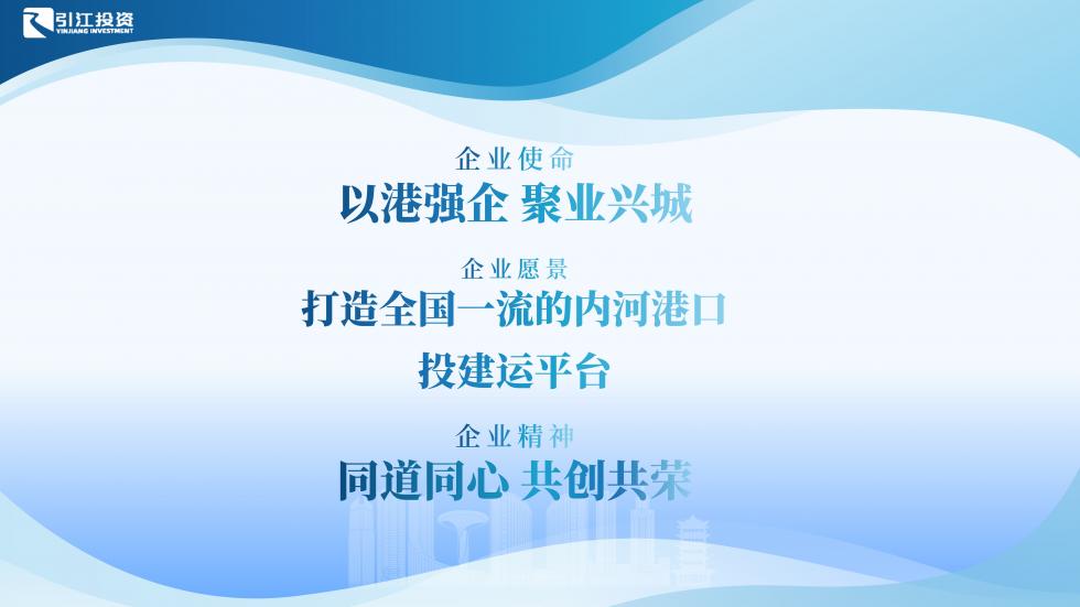 企业文化是构成企业核心竞争力的关键所在,是推动企业发展的不竭动力。市引江投资公司党委结合主责主业,经过全体员工建言献策,多轮打磨修正,在“十五五”开局之年,正式发布公司企业文化理念,拉开了以文化赋能发展、以精神凝聚队伍的崭新篇章。企业使命:“我们为何而存在”?以港强企聚业兴城立足国家与区域战略宏图,精准对接交通强国、水运安徽及江淮航运中心建设,秉持水利惠民、航运兴邦的初心,积极融入江海联运大格局。打造江淮运河沿线综合投资开发平台,推动临港产业集聚发展,推进业务协同,实现港产城深度融合与协同振兴,全面激活运河经济发展动能。以水运之兴、江海之通赋能区域高质量