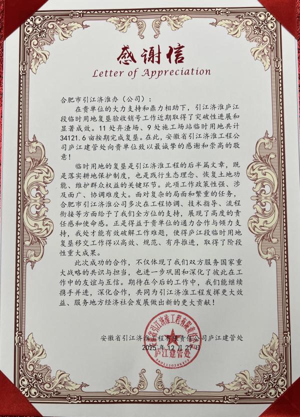 市引江济淮办副主任、市引江投资公司总经理孔斌表示临时用地复垦工作事关耕地保护、生态恢复和群众权益,履职尽责是我司(办)义不容辞的责任,这面锦旗与感谢信,既是对我司(办)工作成效的充分肯定,更是对今后工作的莫大勉励。我们期待与省引江济淮集团公司庐江建管处进一步深化合作,凝聚更强合力,共同为引江济淮工程早日全面发挥效益、持续服务地方经济社会高质量发展做出新的更大贡献!